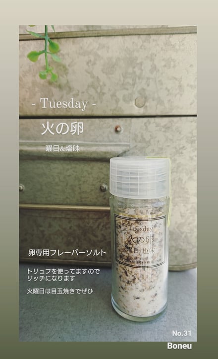 09日 10月 2021 火曜日の朝の卵料理専用ソルト 月曜日から金曜日までの 平日、それぞれの朝の 卵料理専用ソルト 写真は「火曜日専用」 休み明け二日目には 仕事もググっと力を出したいところ 月曜日にならしたので頭も身体も絶好調の火曜日 とはいえ 一週間は始まったばかり そんな火曜日には トリュフ香るリッチな朝で出勤したいのが ビジネスマンってものでしょう。 目玉焼き 薄味の玉子焼き ゆで卵 スクランブルエッグ 毎朝の決まった食卓を 更に自分スタイルへ。 食卓アプリ№31 「火の卵」 tagPlaceholderカテゴリ: お知らせ コメントをお書きください コメント: 0