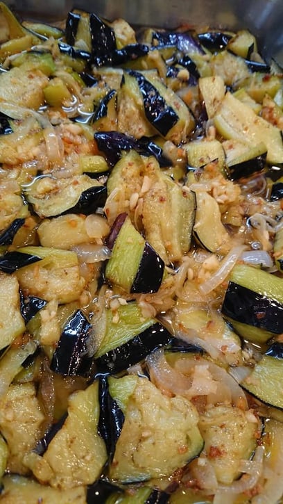 6、耐熱容器などに(3)の茄子をいれて(5)のニンニクと玉ねぎを炒めた油ごと一緒に入れる